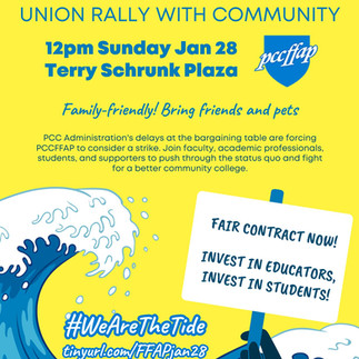 PCC Administration's delays at the bargaining table are forcing their AFT-represented full & part time faculty and academic professionals to consider a strike. Join faculty, academic professionals, students, and supporters to push through the status quo and fight for a better community college. Click here to make a donation to PCCFFAP’s strike fund to ensure they are ready to strike if needed.