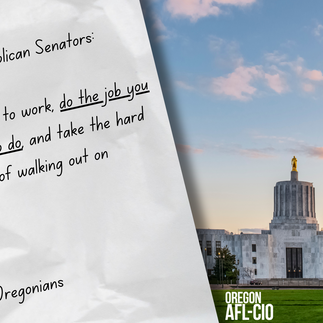 ⚠️ END THE WALKOUT & PASS AN EQUITABLE STATE BUDGET State lawmakers just learned there is $1.9 billion more revenue than expected for our State’s budget. That means there is more money than ever available to invest in our communities. It is time for the legislature to invest in the things Oregonians need to have a fair shot: housing, child care, health care, schools, wildfire and drought relief, access to food, a strong public workforce, and more. Unfortunately, thirteen Senators are blocking policies they don’t like by walking off the job and preventing the legislature from functioning. Our policies and budgets can’t pass until all the lawmakers who are skipping work show up! Enough is enough. The stakes are too high for our communities. They must come back to work.
